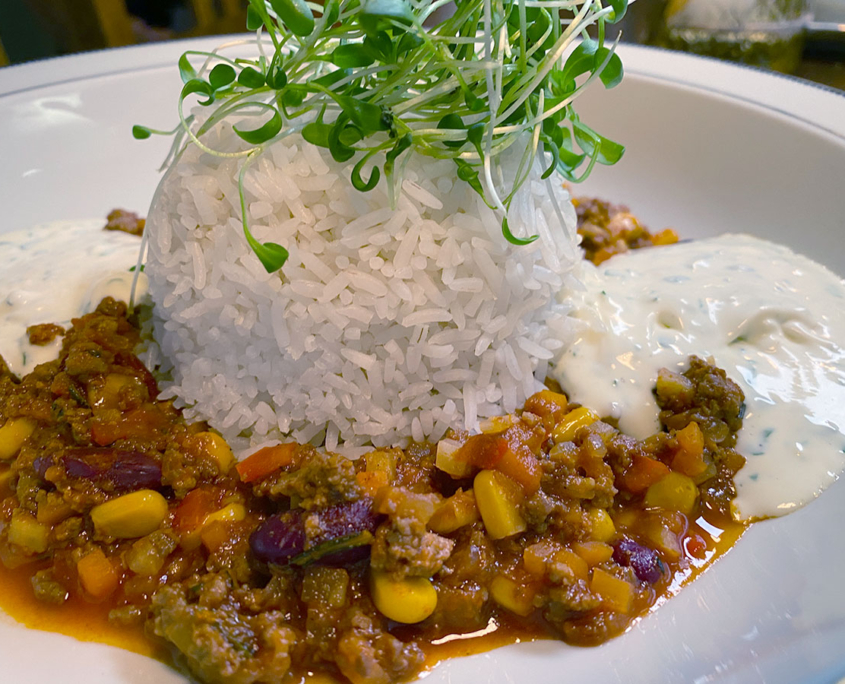 Hauptgang: Chili con Carne (CH) mit Basmatireis und Crème fraîche